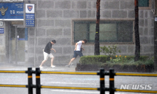 【서울=뉴시스】이영환 기자 = 갑작스레 천둥과 번개를 동반한 소나기가 내린 28일 오후 서울 중구 충무로 일대에서 시민들이 비를피해 발걸음을 재촉하고 있다. 2018.07.28.