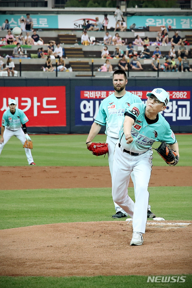 【서울=뉴시스】이영환 기자 = 아주대학교 경기남부권역외상센터장 이국종 교수가 28일 오후 수원 KT 위즈파크에서 열린 KT 위즈와 LG 트윈스의 경기에서 시구를 하고 있다. 2018.07.28.(사진=KT 위즈 제공)