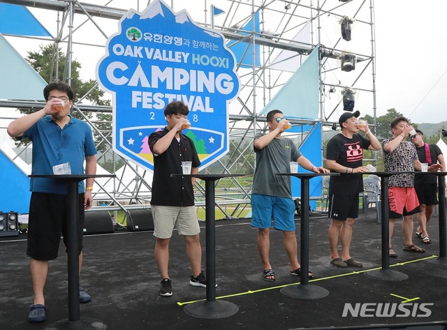 【서울=뉴시스】지난 28일 오후 강원 원주시에서 열린 오크밸리 캠핑 페스티벌 에딩거 맥주 빨리 마시기 대회 참여자들이 맥주를 마시고 있다. 2018.07.29.(사진=비어케이 제공)