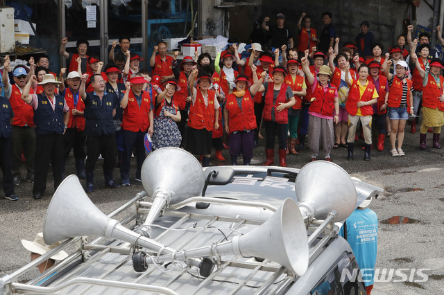 【서울=뉴시스】최동준 기자 = 노량진수산시장 현대화비상대책 총연합회 회원들이 29일 서울 동작구 구 수산시장 앞에서 '노량진 구 수산시장 고급통로, 생존권 쟁취 결의대회'를 하고 있다. 2018.07.29.