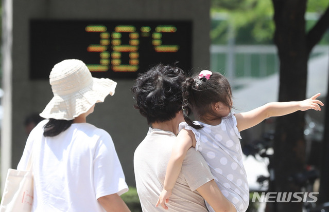 【서울=뉴시스】임태훈 기자 = 연일 기록적인 폭염이 지속되고 있는 29일 오후 서울 성동구 한 건물 앞에 설치된 온도계가 38도를 나타내고 있다. 2018.07.29. [email protected]