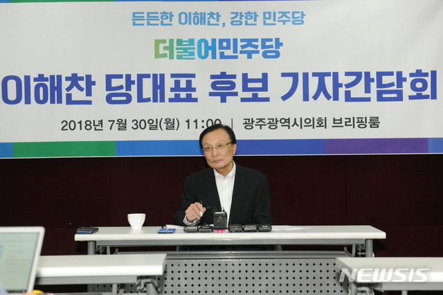 【광주=뉴시스】송창헌 기자 = 더불어민주당 당권 주자로 나선 이해찬 의원이 30일 오전 광주시의회 브리핑룸에서 기자회견을 하고 있다. 2018.07.30.