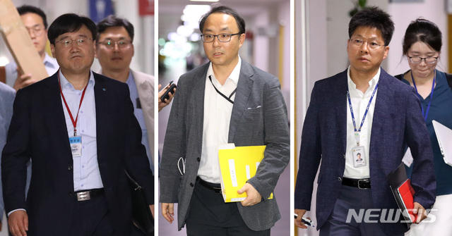 청문회에 참석한 진에어 최정호 대표이사(왼쪽)와 국토교통부 관계자들, 청문회를 주재하는 윤진환 항공정책과장(가운데)이 청문회장으로 향하고 있다. 2018.07.30.