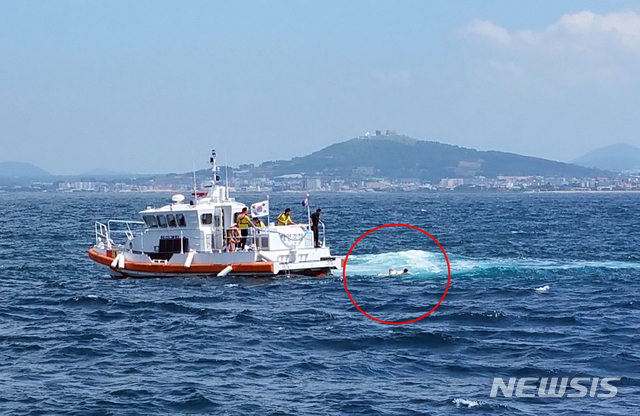【서귀포=뉴시스】우장호 기자 = 1일 오전 10시37분께 제주 서귀포시 대정읍 가파도 서쪽 1.3㎞ 해상에서 세화포구에서 실종된 여성 관광객 최모(38·붉은 원)씨의 시신이 발견됐다. 신고를 받고 출동한 해경이 최씨의 시신을 수습하고 있다. 2018.08.01. (사진=서귀포해양경찰서 제공)