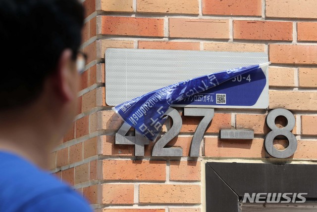 【서울=뉴시스】박진희 기자 = 살인적인 폭염이 연일 이어지는 2일 오후 서울 동작구 사당동 주택가에서 녹아내린 도로명 표지판을 한 주민이 바라보고 있다. 2018.08.02.