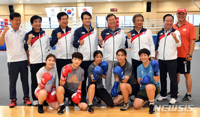 【진천=뉴시스】 사진공동취재단 = 2018 자카르타·팔렘방 아시안게임에 출전할 복싱 국가대표팀이 2일 오전 충북 진천 국가대표선수촌에서 언론 공개 행사를 했다. 도종환 문화체육관광부 장관(두번째줄 왼쪽 다섯번째)이 선수들과 기념촬영 하고 있다. 2018.08.02.