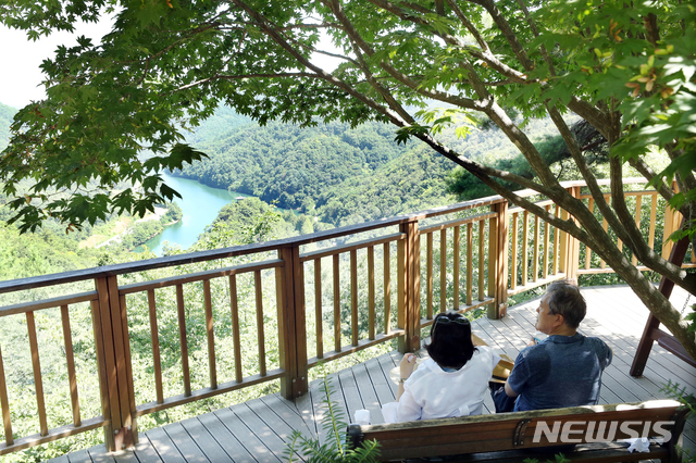 【서울=뉴시스】박진희 기자 = 휴가중인 문재인 대통령과 부인 김정숙 여사가 2일 오전 충남 대전 장태산휴양림에서 산책을 하고 있다.