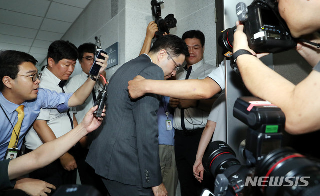 【서울=뉴시스】이종철 기자 = 드루킹 댓글조작 의혹을 수사하는 허익범 특별검사팀의 윤원일 검사가 2일 오전 서울 여의도 국회 의원회관에서 김경수 경남도지사가 의원재직시 사용하던 국회에 보관된 컴퓨터 등에 대한 압수수색을 위해 김정호 의원 사무실로 들어가고 있다. 2018.08.04.