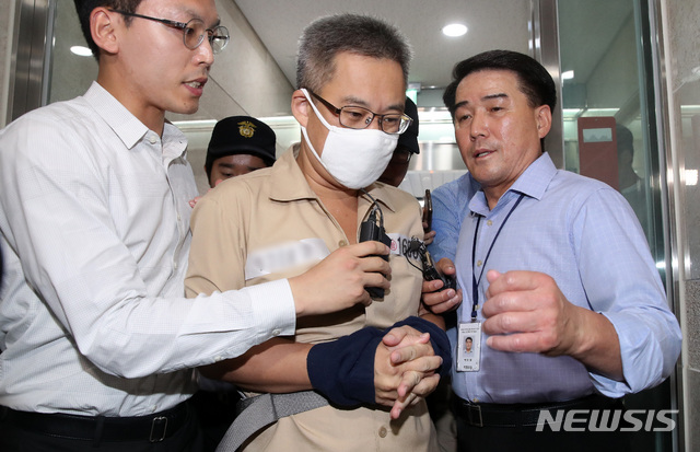 【서울=뉴시스】김선웅 기자 = 인터넷상 불법 댓글 조작 혐의로 구속 기소된 '드루킹' 김 모씨가 김경수 경남지사 소환조사를 이틀 앞둔 4일 오후 서울 서초구 강남역 인근에 위치한 특검사무실로 소환되고 있다. 2018.08.04.