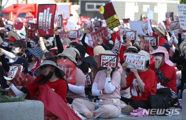 【서울=뉴시스】김선웅 기자 = 4일 오후 서울 종로구 광화문광장에서 열린 불법 몰래카메라 촬영 규탄 집회에서 참가 여성들이 구호를 외치고 있다. 2018.08.04. [email protected]