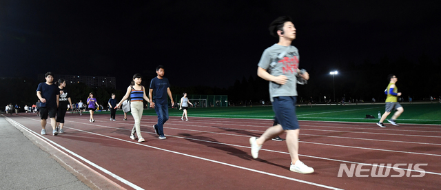 【광주=뉴시스】신대희 기자 = 지난 4일 오후 광주 북구 용봉동 전남대학교 대운동장에서 시민들이 운동을 하며 열대야를 이겨내고 있다. 2018.08.05. [email protected]