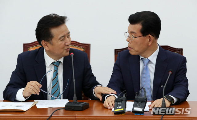 【서울=뉴시스】홍효식 기자 = 장영하(오른쪽) 바른미래당 전 성남시장 후보가 5일 오후 서울 여의도 국회에서 이재명 경기도지사가 형인 고 이재선 씨를 정신병원에 강제입원시키려고 한 증거에 대해 추가 입장을 밝히기 앞서 김영환 당대표 후보와 대화를 나누고 있다. 2018.08.05.