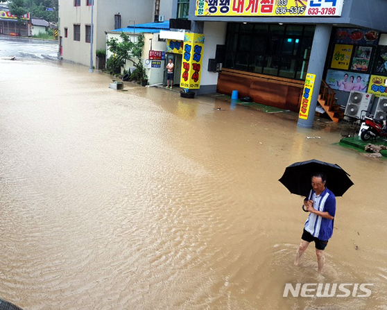 【속초=뉴시스】박종우 기자 = 6일 오전 갑작스런 폭우로 속초해양경찰서 인근 도로가 침수가 돼 상인과 주민들이 불편을 겪고 있다. 2018.08.06. (사진=속초해양경찰서 제공)