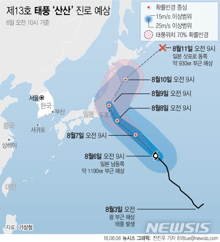 【서울=뉴시스】전진우 기자 = 6일 기상청에 따르면 태풍 '산산'이 오전10시 현재 일본 도쿄 남동쪽 1190㎞ 부근 해상에서 시속 20㎞의 속도로 북상중이다.