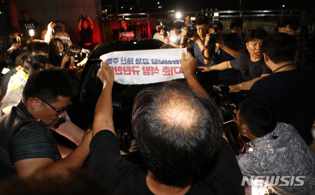 【서울=뉴시스】이영환 기자 = 김기춘 전 청와대 비서실장이 석방돼 6일 새벽 서울 송파구 동부구치소를 나서 차량에 탑승하자 석방을 반대하는 시민들이 막아서고 있다.