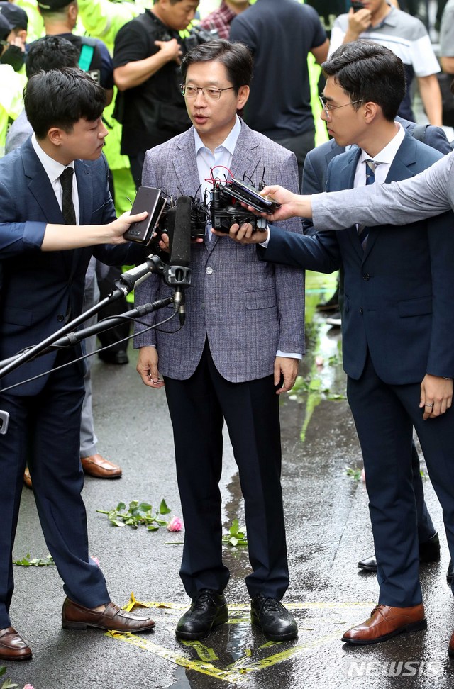 【서울=뉴시스】고범준 기자 = 김경수 경남도지사가 드루킹 댓글 조작 의혹 사건과 관련해 피의자 신분으로 조사를 받기 위해 6일 오전 서울 서초구에 마련된 허익범 특별검사팀으로 출석, 취재진 질문에 답변하고 있다. 2018.08.06.