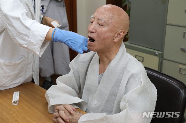 【서울=뉴시스】 대한불교조계종 총무원장 설정스님이 7일 서울의대 법의학교실에서 유전자 검사를 위해 구강 점막세포 채취를 하고 있다.