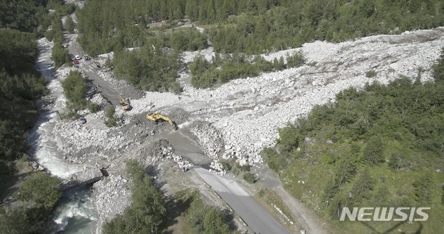 【쿠르마외르=AP/뉴시스】몽블랑산 남동쪽에 위치한 이탈리아 북부 쿠르마외르에서 6일(현지시간) 오후 두 차례의 산사태가 연이어 발생해 2명이 사망하고 수백명이 대피했다. 2018.08.08