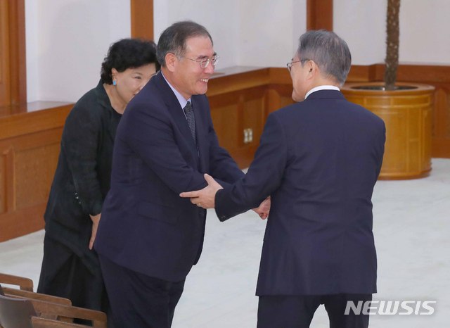 【서울=뉴시스】전신 기자 = 문재인 대통령이 10일 청와대 본관 충무실에서 이개호 농림축산식품부 장관과 인사하고 있다. 2018.08.10.