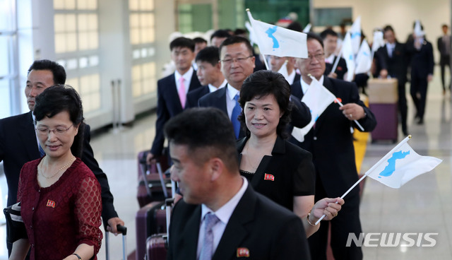 【파주=뉴시스】박주성 기자 = 남북노동자통일축구대회에 참가하는 북측 대표단이 10일 오전 경기도 파주 남북출입사무소로 입경하고 있다. 2018.08.10.