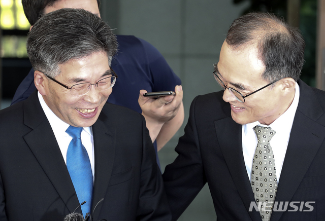 【서울=뉴시스】최진석 기자 = 문무일(오른쪽) 검찰총장이 10일 오후 서울 서초구 대검찰청을 찾은 민갑룡 경찰청장을 배웅하며 미소짓고 있다. 2018.08.10.
