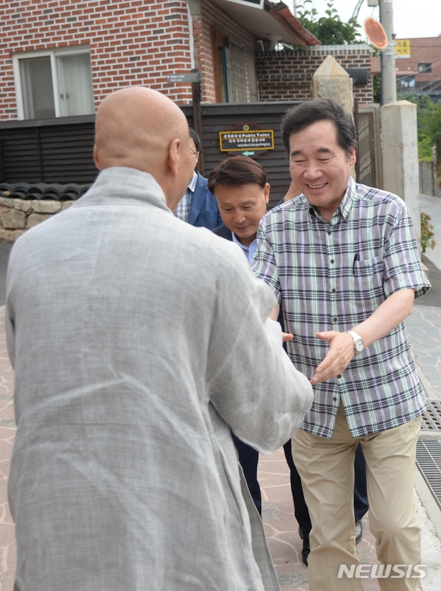 【군산=뉴시스】고석중 기자 = 이낙연 국무총리가(오른쪽)가 11일, 국내 유일의 일본식 사찰인 전북 군산의 동국사(東國寺)를 방문해 마중나온 주지 종걸스님과 반갑게 악수를 하고 있다. 2018.08.11.