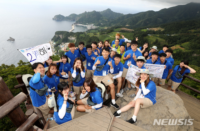 【울릉=뉴시스】이영환 기자 = 제10회 대한민국 해양영토 대장정 대원들이 11일 오전 경북 울릉군 울릉읍 내수전 일출전망대에서 저동항을 배경으로 기념촬영을 하고 있다.
