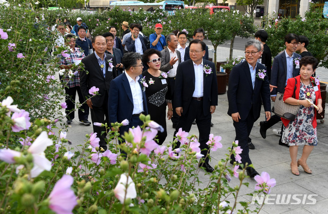【서울=뉴시스】김진아 기자 = 10일 서울 광화문광장에서 산림청과 서울시가 공동 주최한 '제28회 나라꽃 무궁화 전국축제'에서 김부겸 행정안전부 장관(앞줄 가운데), 김재현 산림청장(앞줄 오른쪽 두번째) 등이 전시된 무궁화를 관람하고 있다. 2018.08.11. (사진=산림청 제공)