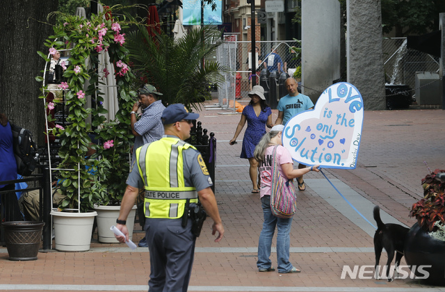 【샬러츠빌(미 버지니아주)=AP/뉴시스】지난해 8월11일 백인 우월주의자들과 반대 시위대 간 충돌로 여성 1명이 숨진 유혈충돌 1주년을 맞은 11일 버지니아주 샬러츠빌 시내 곳곳에 경찰이 배치돼 충돌 재개 가능성을 놓고 긴장이 감도는 가운데 한 방문객이 '사랑만이 유일한 해결책'이라고 쓰인 하트 모양의 판을 들고 있다. 도널드 트럼프 대통령은 이날 트위터에 "모든 형태의 인종차별과 폭력 행위에 반대한다"고 말했다. 2018.8.12