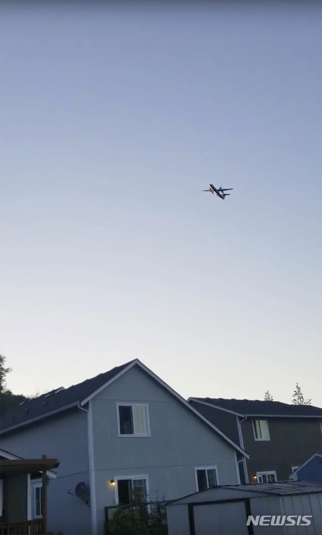 【시애틀(미 워싱턴주)=AP/뉴시스】지난 10일(현지시간) 미 워싱턴주 이튼빌 상공을 신원이 공개되지 않은 남성이 훔친 호라이즌 항공의 터보프로펠레 비행기가 날고 있다. 이 남성은 전투기 2대의 추적을 받아 인근 푸겟 사운드섬에 추락해 사망했다. 한 교통안전 전문가는 내부 직권이 견제 없이 항공기 내부에 접근할 수 있음을 드러낸 이 사건은 항공이 안고 있는 가장 큰 위협을 보여주고 있다고 말했다. 그는 군 전투기가 곧바로 추적에 나선 것이 비극을 막았을 가능성이 있다고 말했다. 2018.8.12