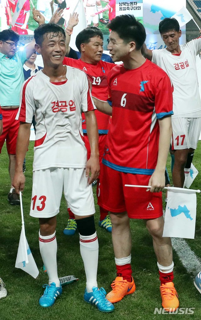 【서울=뉴시스】조성봉 기자 = 11일 오후 서울 마포구 상암 월드컵경기장에서 열린 남북노동자통일축구대회에서 조선직총 경공업팀 박승혁(왼쪽)선수와 민주노총 김정록 선수가 이야기를 나누고 있다.  2018.08.11.
