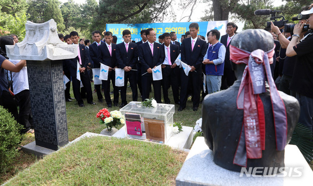【남양주=뉴시스】김선웅 기자 = 남북노동자통일축구대회 참석차 방남한 북한 노동단체 조선직업총동맹(직총) 소속 노동자들이12일 오전 경기 남양주 마석 모란공원을 찾아 故 전태일 열사 묘소를 참배하고 있다. 2018.08.12.