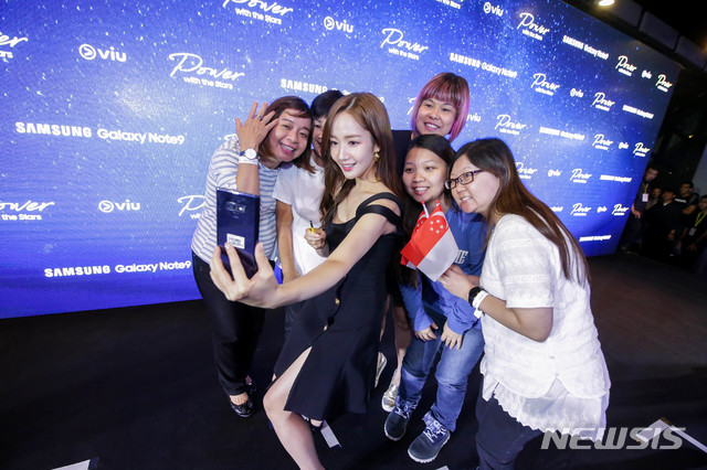 사진은 '갤럭시 노트9' 출시 행사에서 배우 박민영이 팬들과 '갤럭시 노트9'으로 셀피를 촬영하고 있다.