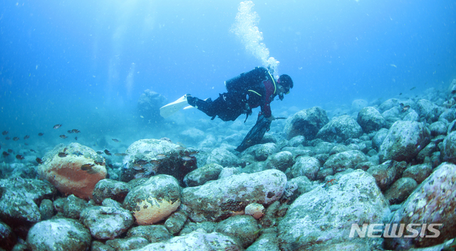 【독도=뉴시스】김경목 기자 = 제73주년 광복절을 사흘 앞둔 12일 ㈔한국수중환경안전협회(회장 황대영 독도사랑국민연합 상임대표) 소속 스쿠버다이버가 독도의 서도 주변 바닷속에서 갯녹음(백화현상)을 가속화시키는 조식동물인 불가사리와 성게를 구제(驅除)하기 불가사리를 손으로 잡아 망태기에 넣고 있다.