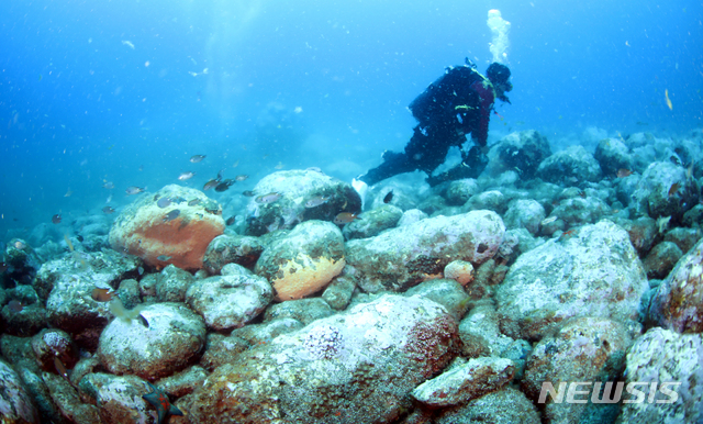 【독도=뉴시스】김경목 기자 = 제73주년 광복절을 사흘 앞둔 12일 우리나라 최동단 독도의 서도 바닷속 혹돔굴 주변에서 아지랑이가 관찰되고 있다. 이 현상은 냉수대가 갑자기 올라와 비교적 따뜻한 수온약층에서 섞일 때 일어난다. 2018.08.12.