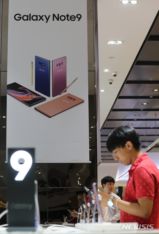【서울=뉴시스】전진환 기자 = 갤럭시 노트9 사전예약이 시작된 13일 오전 서울 서초구 삼성전자 딜라이트샵에서 소비자가 노트9를 체험해 보고 있다. 2018.08.13. [email protected]