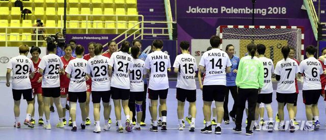 【자카르타(인도네시아)=뉴시스】최진석 기자 = 남북 여자 핸드볼 대표팀 선수들이 14일(현지시각) 오후 자카르타 포키 찌부부르 스타디움에서 열린 2018 자카르타-팔렘방 아시안게임 여자 핸드볼 조별리그 A조 1차전 경기 경기 한국과 북한의 경기에 앞서 인사를 하고있다. 2018.08.14.