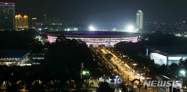 【자카르타(인도네시아)=뉴시스】추상철 기자 = 2018 자카르타-팔렘방 아시안게임 개막을 하루 앞둔 17일(현지시각) 오후 개막식이 열리는 인도네시아 자카르타 겔로라 붕 카르노(GBK) 주경기장 조명이 도심을 밝히고 있다. 2018.08.17.