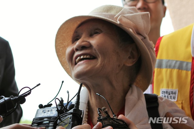 【속초=뉴시스】박종우 기자 = 이산가족 상봉단 방북 하루 전날인 19일 오후 1시께 이금선(87)씨가 접수를 위해 강원 속초시 한화리조트에 도착했다. 2018.08.19.