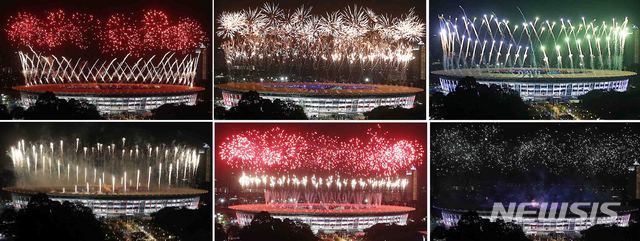 【자카르타(인도네시아)=뉴시스】추상철 기자 = 2018 자카르타-팔렘방 아시안게임 개막식이 열린 18일(현지시각) 오후 인도네시아 자카르타 겔로라 붕 카르노(GBK) 주경기장에서 축하 불꽃이 자카르타 도심을 수 놓고 있다.