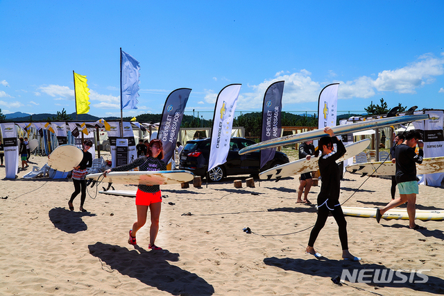 【서울=뉴시스】조성봉 기자 = 쉐보레가 지난 18일 강원도 양양군 서피비치에서 ‘쉐보레 앰버서더(Chevrolet Ambassador)’를 대상으로 제품 시승과 전문 서퍼로부터 강습을 받을 수 있는 ‘서핑데이(Surfing Day)’ 이벤트를 개최했다. 2018.08.19.(사진=쉐보레 제공)