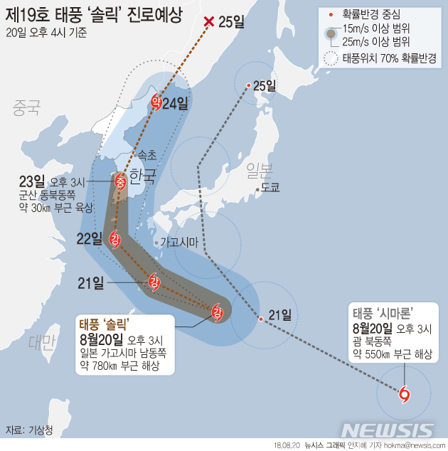 [그래픽]제19호 태풍 ‘솔릭’ 진로 예상 (오후 4시)