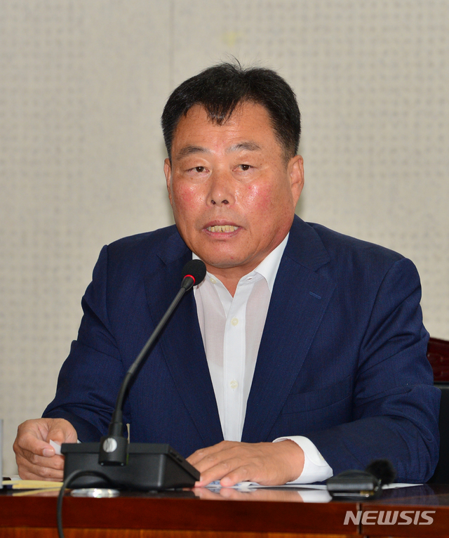 【무안=뉴시스】변재훈 기자 = 20일 오전 전남 무안군 삼향읍 전남도청 정약용실에서 무안공항 활성화를 위한 업무협약식이 열린 가운데 김산 무안군수가 모두발언을 하고 있다. 2018.08.20.