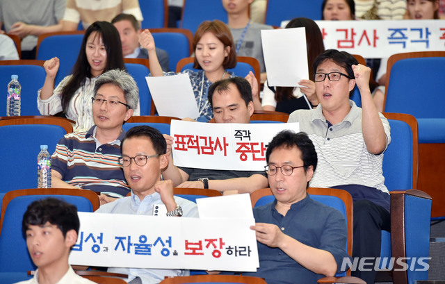 【대구=뉴시스】우종록 기자 = 20일 오후 대구 달성군 현풍면 DGIST(대구경북과학기술원) E7-L29 강당에서 DGIST 직원, 연구원, 학생, 교원으로 구성된 참석자들이 과학기술정보통신부의 부당감사를 규탄하는 구호를 외치고 있다. 2018.08.20.