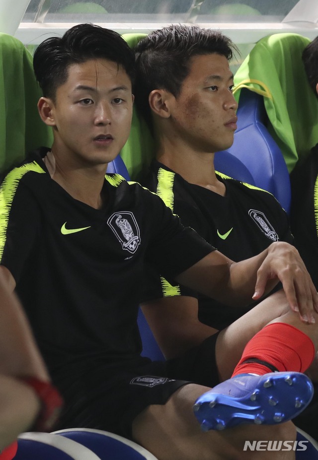 【반둥(인도네시아)=뉴시스】최진석 기자 = 20일(현지시각) 인도네시아 반둥 시 잘락 하루팟 스타디움에서 열린 2018 자카르타·팔렘방 아시안게임 남자 축구 조별리그 E조 3차전 대한민국과 키르기스스탄의 경기. 대한민국 이승우와 황희찬이 그라운드를 바라보고 있다. 2018.08.20.