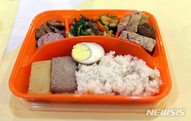 【금강산=뉴시스】뉴스통신취재단 = 제21차 이산가족 상봉행사 1회차 둘째날인 21일 오전 외금강호텔에서 열린 개별중식에 북측이 제공된 도시락. 2018.08.21. [email protected]