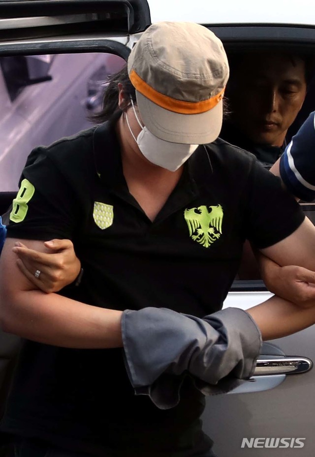【과천=뉴시스】조성봉 기자 = 서해안고속도로 서산휴게소에서 긴급 체포된 '과천 토막 살인 사건' 유력 용의자가 21일 오후 경기도 과천시 과천경찰서로 압송되고 있다. 2018.08.21.