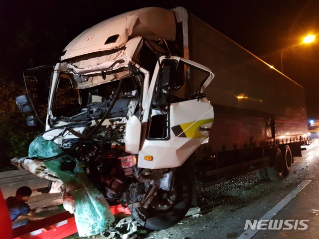 【충주=뉴시스】송휘헌 기자 = 21일 오후 10시5분께 충북 충주시 앙상면 중부내륙고속도로 상행선 중원터널 인근에서 추돌사고가 발생해 1명이 다쳤다. 2018.08.22. (사진=충북지방경찰청 제공)