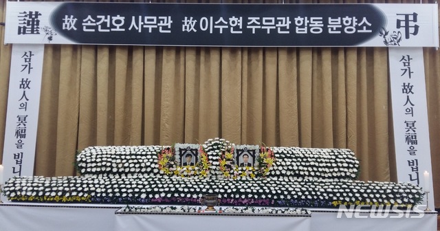 【봉화=뉴시스】김진호 기자 = 22일 경북 봉화군청 대회의실에 전날 엽총 난사 사건으로 숨진 고 손건호(왼쪽) 사무관 및 고 이수현 주무관의 합동분향소가 차려져 있다. 2018.08.22