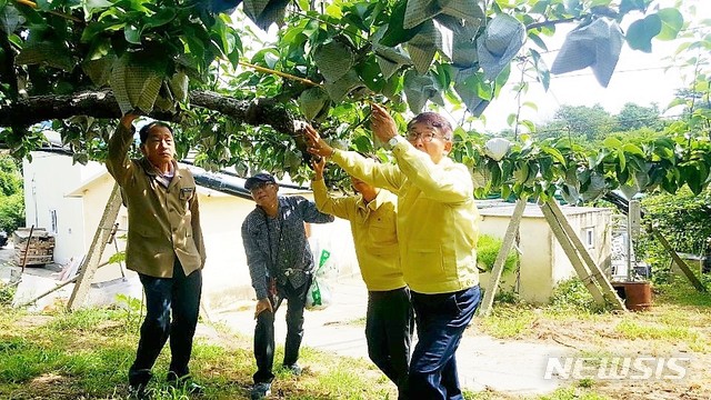 【울산=뉴시스】조현철 기자 = 농협 울산지역본부(본부장 추영근)는 22일 긴급 재해대책위원회를 구성하고 제19호 태풍 '솔릭' 북상에 따른 집중호우와 태풍 피해에 대비하기 위해 울주군 서생·온양지역 배 농가와 미곡종합처리장(농소·두북)을 현장점검했다. 2018.08.22. (사진=울산농협 제공)